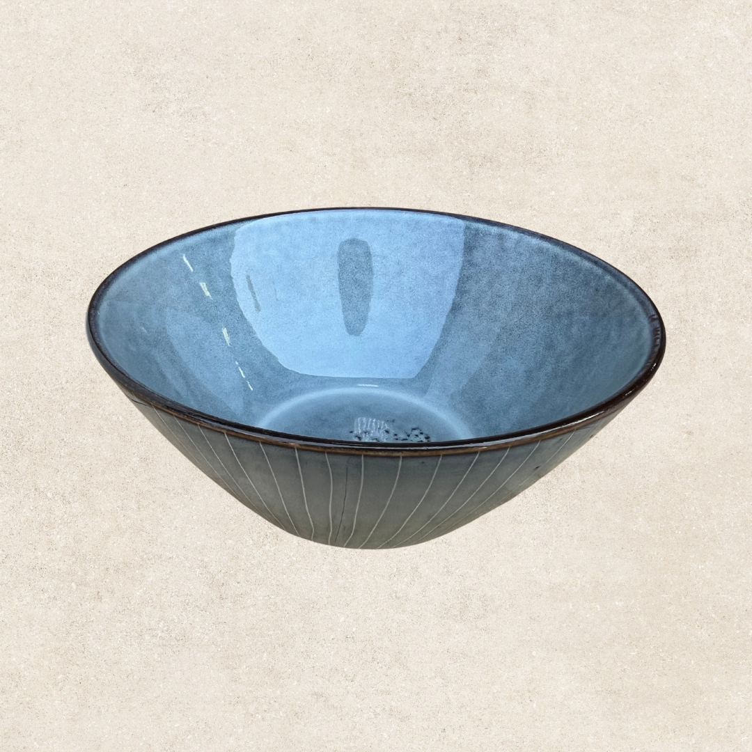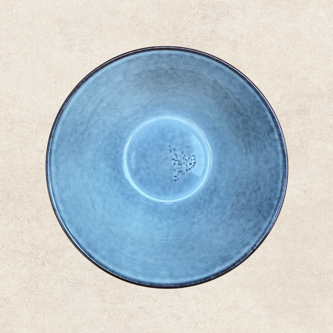 Esta colección celebra la belleza de las imperfecciones creadas a mano. Cada pieza revela un carácter propio: líneas marcadas que recorren la superficie, puntos que aportan textura, tonalidades que van del azul profundo al celeste más luminoso. Platos, bowls, tazas, vasos, ensaladeras y bandejas conviven en una misma familia que se siente auténtica, armoniosa y versátil, ideal para mesas que buscan estilo, personalidad y un toque artesanal en cada detalle.